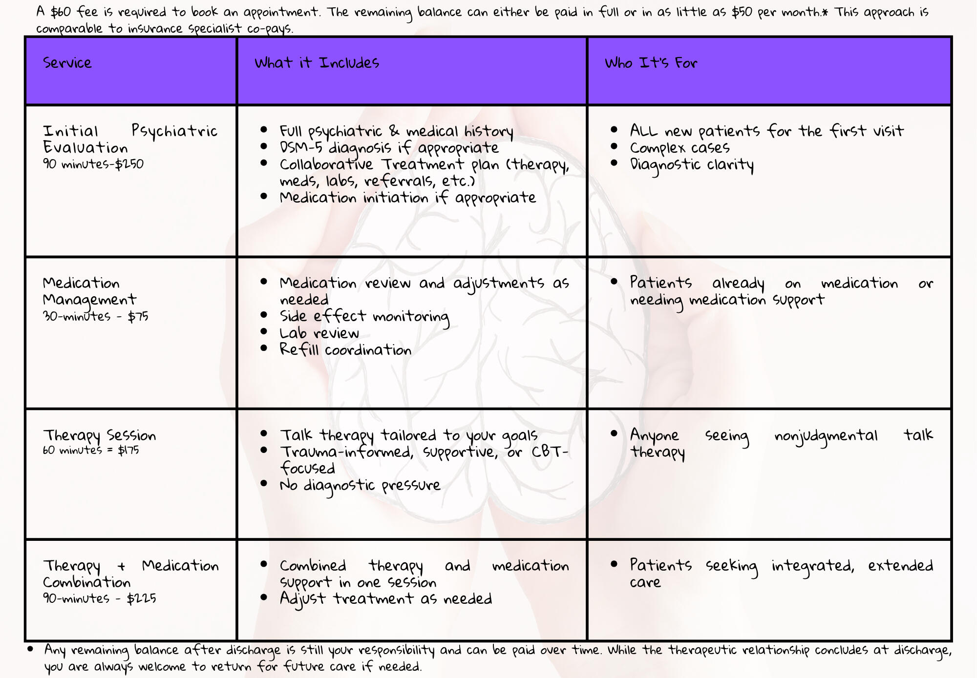 I provide psychiatric care and therapy that’s relational, trauma-informed, and tailored to people whose stories don’t fit into a 15-minute visit.Whether you’re navigating:🌿 Trauma recovery🧠 Disordered eating or body image issues⚡ Neurodivergence or burnout🩶 Anxiety, grief, or chronic overwhelmYou’ll get care that’s specialized, human-centered, and priced for real life.
